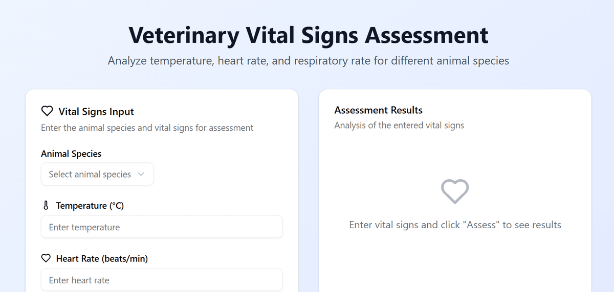 Cette application vous permet de déterminer instantanément si les constantes vitales recueillies sur l'animal se situent dans la fourchette normale. Cliquer surl'image pour être redirigé(e) vers l'application web .